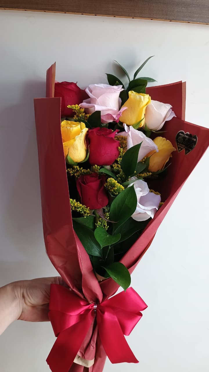 Arranjo com 10 rosas, ruscus e tango