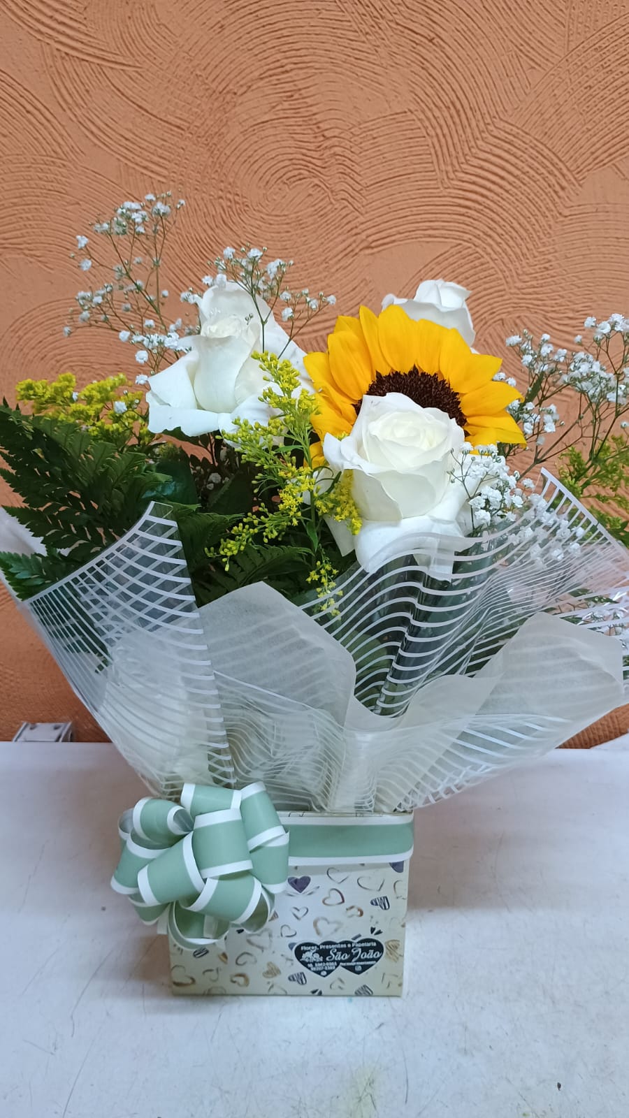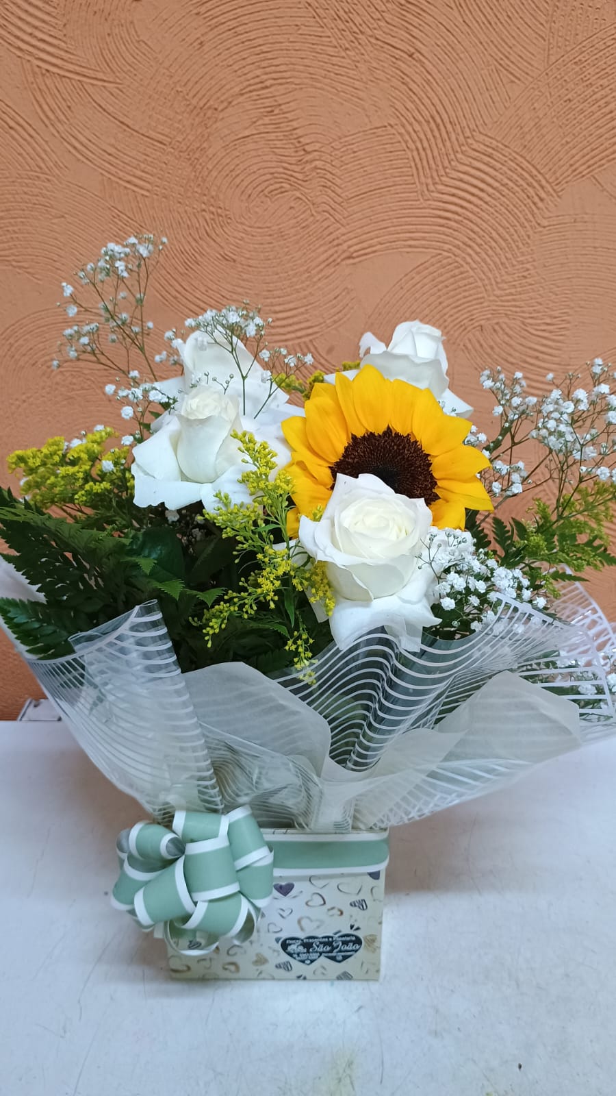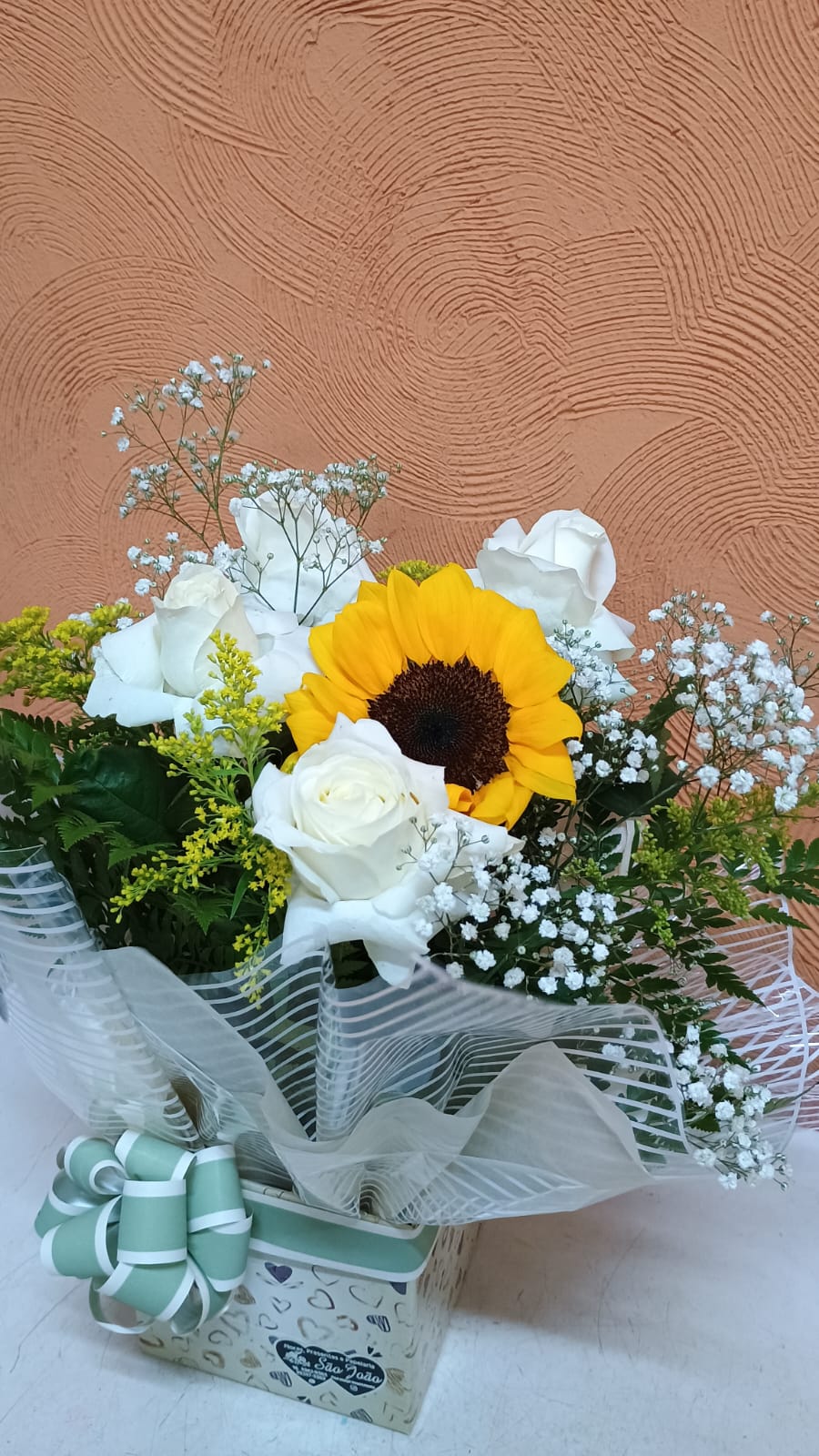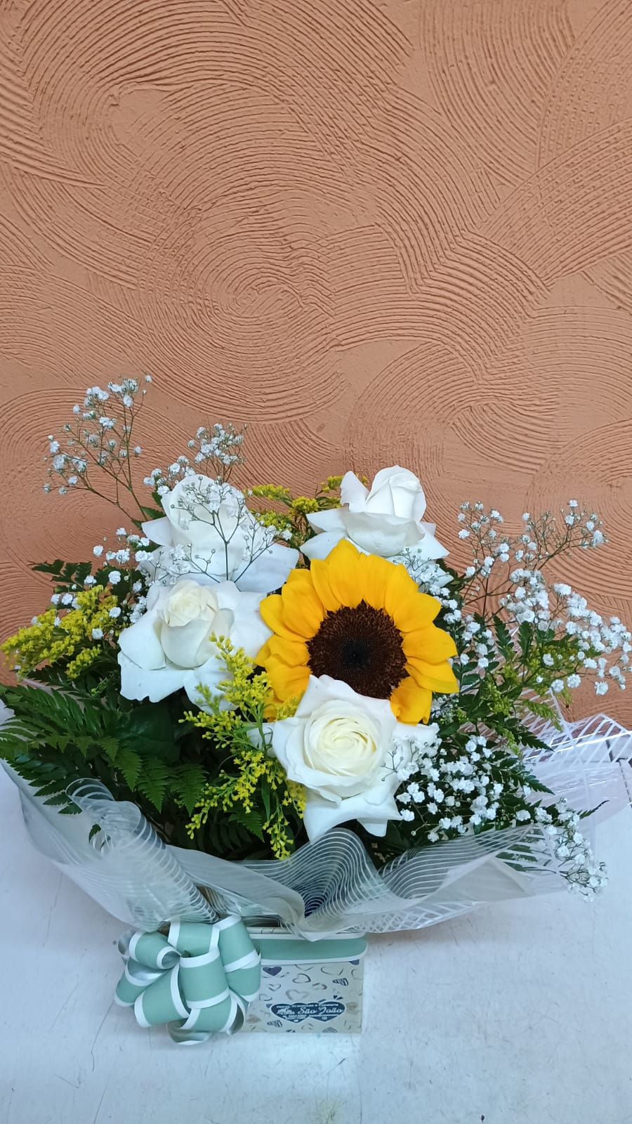Um arranjo no cachepo, com 4 rosas, 1 girassol, mosquitinho, tango, seda e plástico decorativo
